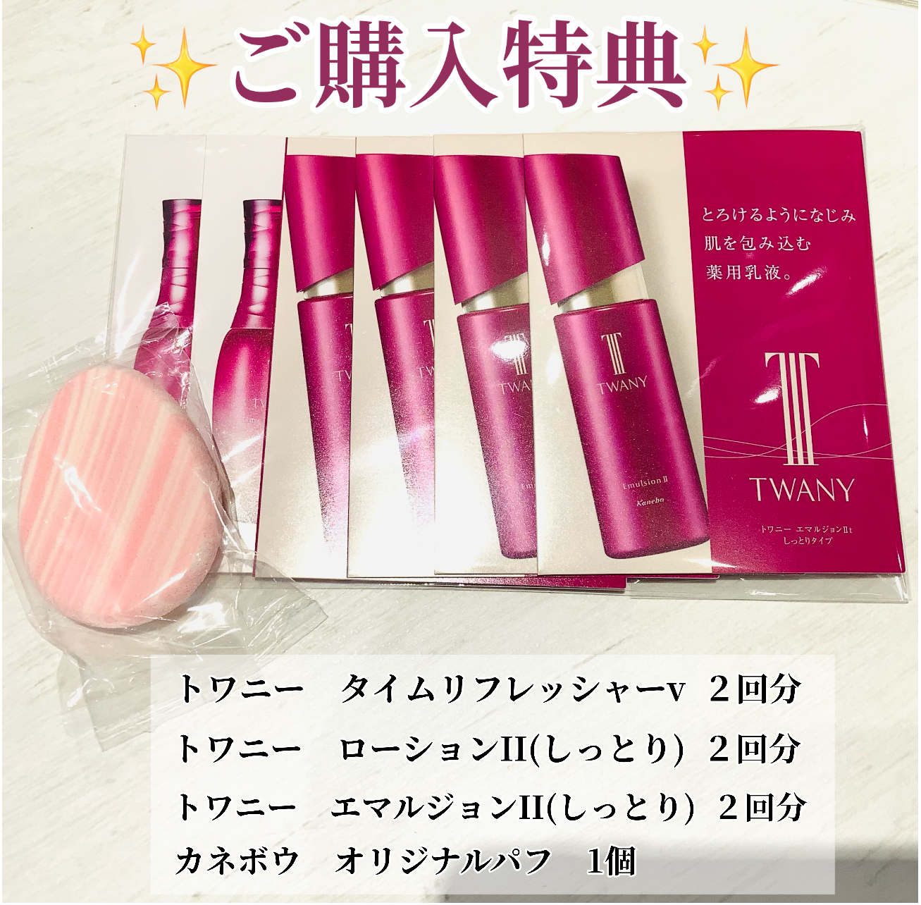 トワニータイムリフレッシャーV、ローションII、エマルジョンII の3種サンプル各2回分プレゼント🎁