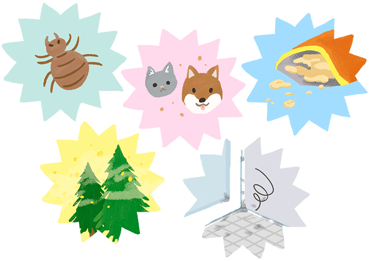 5《接触性皮膚炎の原因物質》花粉や動物の毛などに対してアレルギーをもっていたり、ぜんそく・アトピー性皮膚炎と診断された事がある
