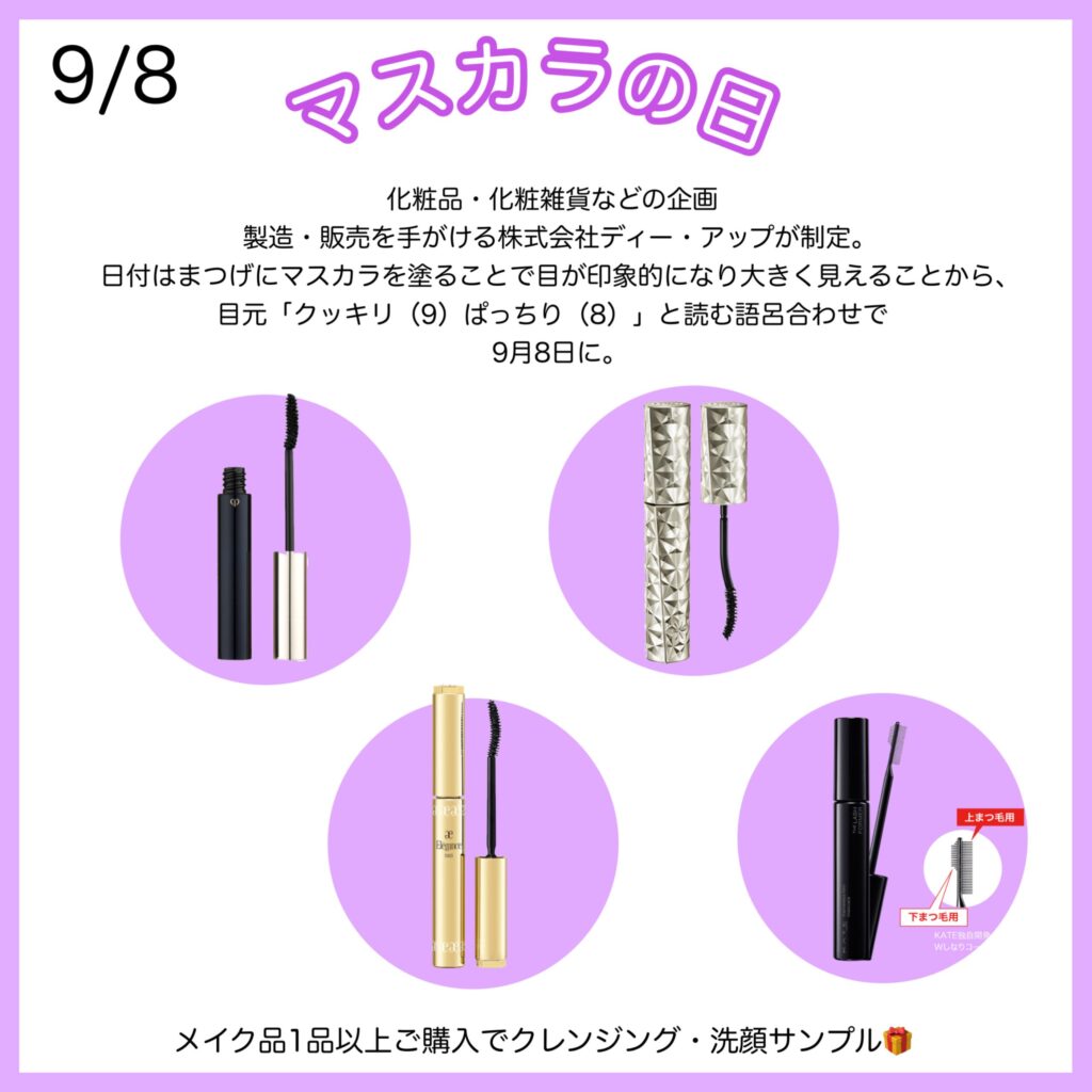 日付はまつげにマスカラを塗ることで目が印象的になり大きく見えることから目元「クッキリ(9)ぱっちり(8)」と読む語呂合わせで