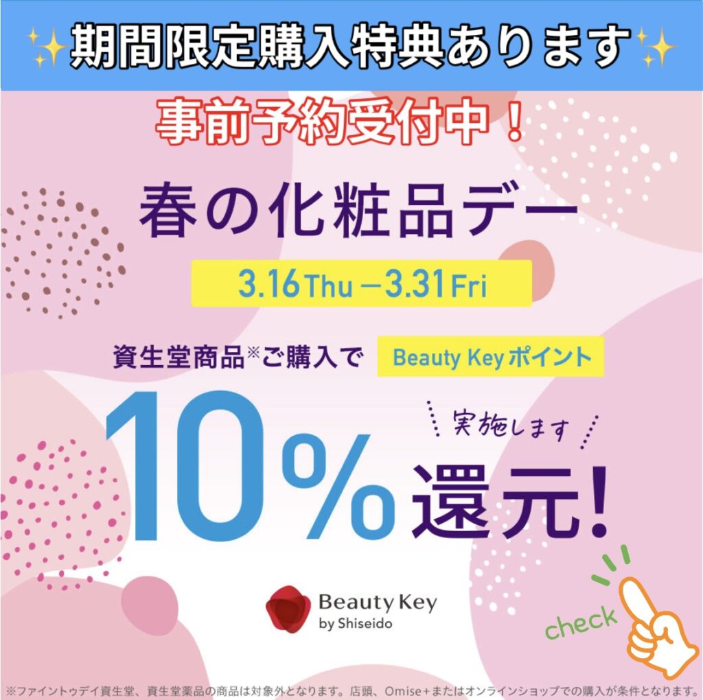 ◎上記期間中、店頭でのご購入金額(税抜)の『10%をBeauty Keyポイントで還元』