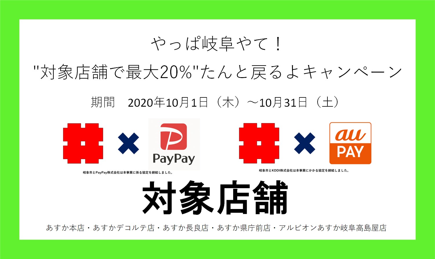 このキャンペーンでは、岐阜市内の対象店舗においてキャッシュレス決済サービス「PayPay」または「au PAY」を利用した場合、決済金額の最大20%の「PayPayボーナス」または「au PAY残高」が還元されます。(還元時期などは決済会社により異なります。)