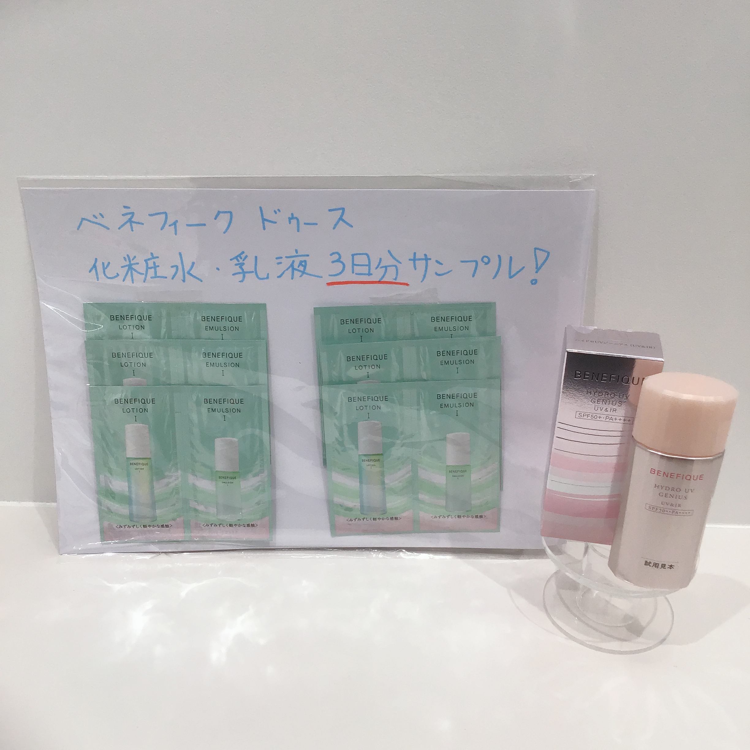 ベネフィークハイドロUVジーニアスご購入で、ベネフィークドゥース化粧水•乳液3日分サンプルプレゼント?